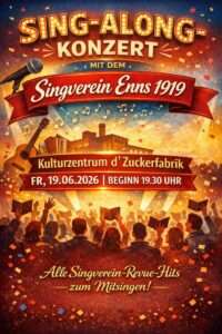 Der Singverein Enns 1919 lädt erstmals zu einem Sing‑Along Konzert ein – einem besonderen Musikerlebnis, bei dem nicht nur zugehört, sondern mitgesungen wird. Die schönsten Hits aus deren Revuen in einer bunten Mischung aller Genres lassen euch einen Abend voller Energie, Emotion und Gemeinschaft erleben. Ganz ohne Vorkenntnisse – einfach mitsingen, mitfühlen und erleben, wie kraftvoll gemeinsames Singen sein kann.